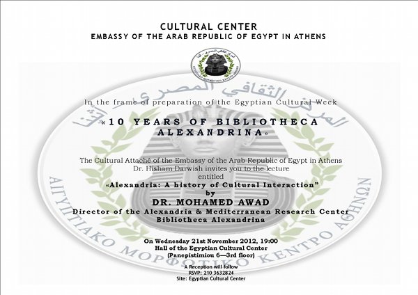 Ομιλία του καταξιωμένου Αιγύπτιου Επιστήμονα, Καθηγητή της Φιλοσοφίας & Διευθυντή του Κέντρου Αλεξανδρινών & Μεσογειακών Ερευνών της Βιβλιοθήκης Αλεξανδρείας Dr. Mohamed Awad με τίτλο: «Αλεξάνδρεια: Πρότυπο της πολιτισμικής αλληλεπίδρασης». Τετάρτη 21 Νοεμβρίου 2012, Ώρα: 19:00 Αίθουσα Μορφωτικού Κέντρου Πρεσβείας Αραβικής Δημοκρατίας Αιγύπτου στην Αθήνα (Πανεπιστημίου 6 – 3ος όροφος)ΔΕΥΤΕΡΗ ΑΙΓΥΠΤΙΑΚΗ ΠΟΛΙΤΙΣΤΙΚΗ ΕΒΔΟΜΑΔΑ ΣΕ ΔΙΑΦΟΡΕΣ ΕΛΛΗΝΙΚΕΣ ΠΟΛΕΙΣΤο Μορφωτικό Κέντρο της Πρεσβείας της Αραβικής Δημοκρατίας της Αιγύπτου στην Αθήνα διοργανώνει σε συνεργασία με τη Διεύθυνση Εξωτερικών Μορφωτικών Υποθέσεων του Υπουργείου Πολιτισμού της Αιγύπτου και διάφορους Ελληνικούς Φορείς για 2η συνεχόμενη χρονιά την Αιγυπτιακή Πολιτιστική Εβδομάδα, με αφορμή την επέτειο των 10 χρόνων από την ίδρυση της Βιβλιοθήκης Αλεξανδρείας. Κατά τη διάρκεια της Πολιτιστικής Εβδομάδας, η οποία θα πραγματοποιηθεί το χρονικό διάστημα από τις 29 Νοεμβρίου ως τις 13 Δεκεμβρίου 2012, θα πραγματοποιηθούν εκδηλώσεις σε διάφορες ελληνικές πόλεις, που αποσκοπούν στην ανάδειξη των ισχυρών πολιτιστικών δεσμών που συνδέουν την Αίγυπτο και τον Αραβικό κόσμο με την Ελλάδα από την αρχαιότητα και μέχρι σήμερα.