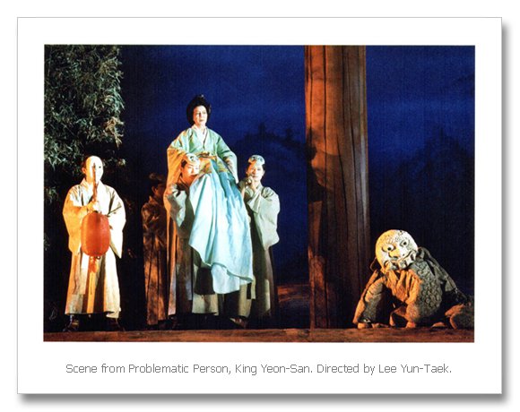 LEE Yun-Taek consistently questions the social responsibility of intellectuals in his dealings with history. His first history play, Problematic Person, King Yeon-San (1995), looks into this question. In the play, intellectuals easily change sides according to where power lies. The ruling aristocracy’s orientation towards power is skillfully woven into the story of King Yeon-San, who was arguably the most vengeful and womanizing king in the history of the Yi dynasty, which lasted from 1392 until 1910. LEE’s second history play, Provincial Scholar, CHO Nam-Myung (2001), differs from his earlier vulgar, physical plays, and takes a highly semiotic approach to the sophisticated culture of the scholar and the aristocrat. LEE’s A Beautiful Man (2006), directed by NAM Mi-Jeong, employs elements of traditional acrobatics and gut to express LEE’s persistent questions about the intellectual’s participation in society.