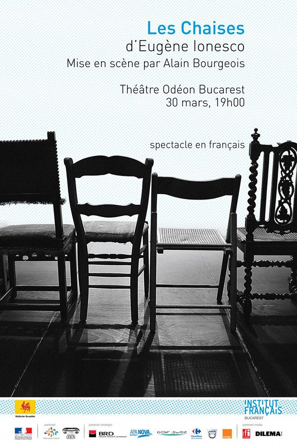 La invitaţia Institutului Francez din Bucureşti şi a Delegaţiei Wallonie-Bruxelles, regizorul de teatru belgian Alain Bourgeois aduce la Bucureşti Scaunele de Eugène Ionesco, într-o nouă interpretare, axată pe tehnica scriiturii teatrale a autorului. Spectacolul va avea o reprezentaţie la Teatrul Odeon-Sala Majestic vineri, 30 martie, de la ora 19.00.