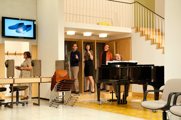 C’est en 1956, sur la scène du Mark Ellinger Theater de Broadway, qu’apparaît pour la première fois la petite marchande de fleurs Eliza Doolittle que son mentor, le distingué professeur Higgins, veut transformer en lady en lui apprenant à parler le bel anglais de l’aristocratie. Aujourd’hui, Christoph Marthaler s’empare, en la décalant bien sûr, de cette émouvante histoire pour en faire un moment de folie musicale, imaginé pour la formidable troupe qu’il a réunie autour de lui. Si la syntaxe, la sémantique et la grammaire sont toujours au programme, c’est dans un laboratoire de langues, composé de petits box individuels hyperréalistes, que les héros marthalériens déclinent une nouvelle fois leur angoisse du temps qui passe, leur mélancolie désuète et leur si touchante solitude. Ils sont tous là pour, entre deux silences, faire leur numéro : chanter, seul ou en chœur, un moment de La Flûte enchantée, Douce nuit, Sainte nuit, les Scènes d’enfants de Schumann ou encore le tube de Wham!, Last Christmas. Car tout est possible dans l’univers de Christoph Marthaler : Karajan peut y croiser Frankenstein, la dégustation collective d’une pomme se transformer en véritable concert vocal, les exercices de diction se muer en un irrésistible comique de répétition. Par la grâce des chanteurs, acteurs et clowns qui le peuplent, ce laboratoire devient alors un jubilatoire espace de liberté, une désopilante rêverie sur la langue et le langage. JFP